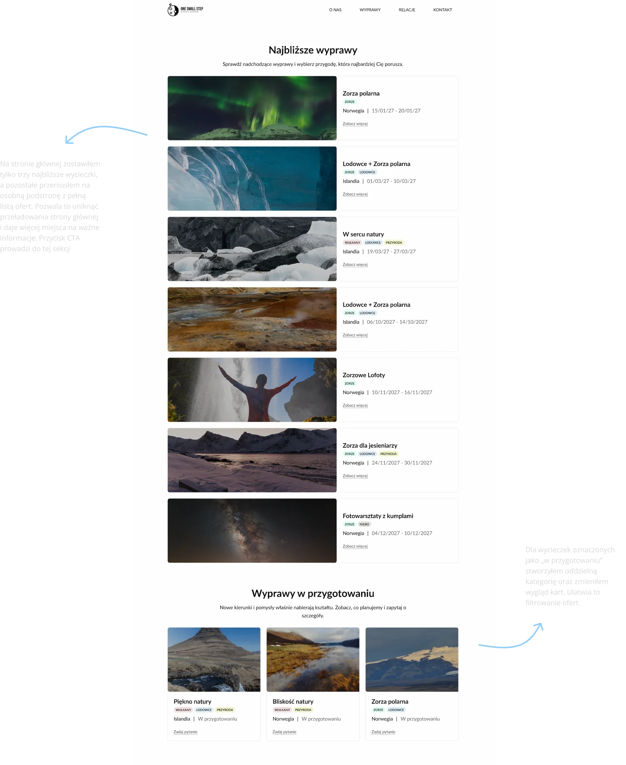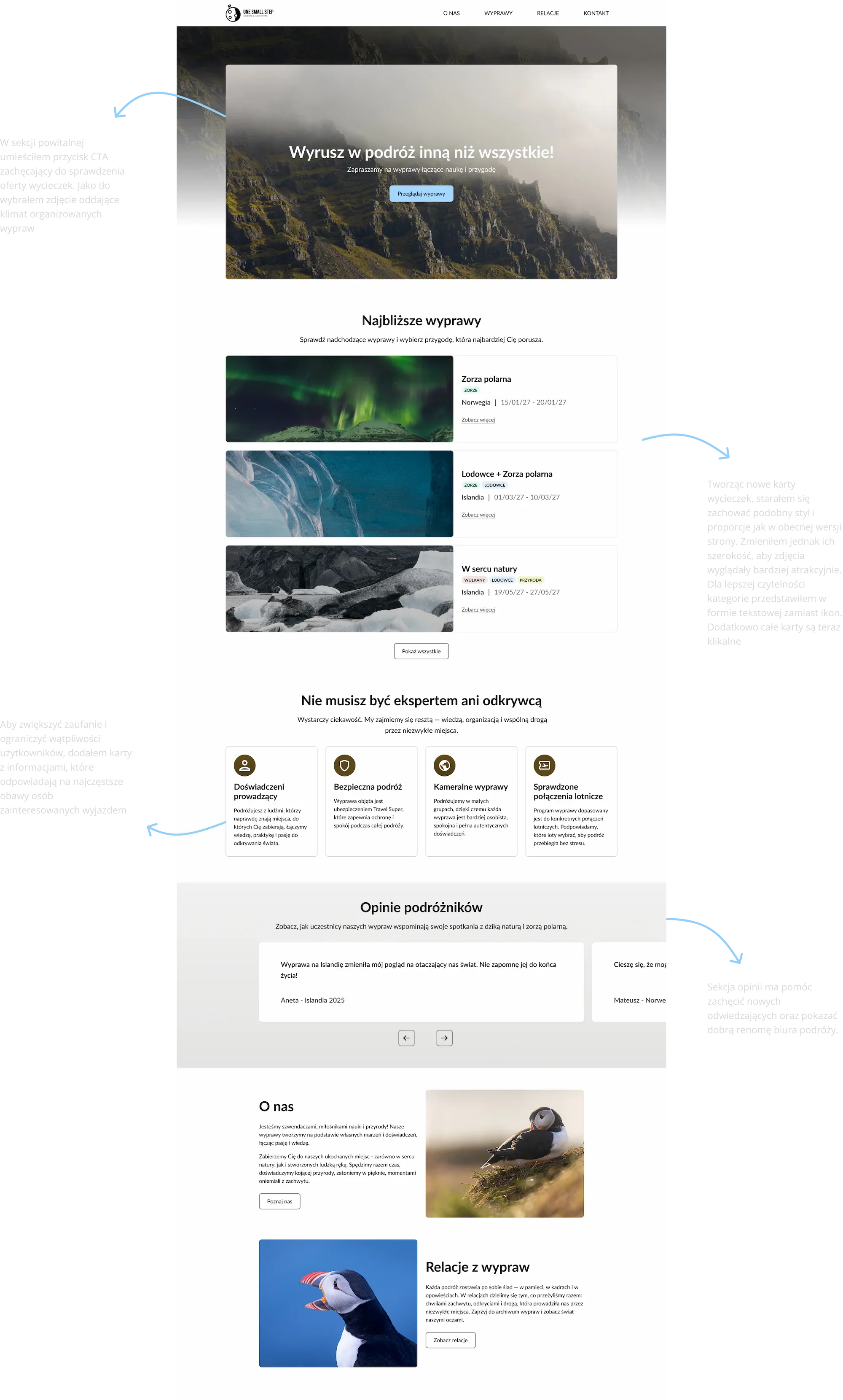Projekt powinien w czytelny sposób prezentować ofertę oraz ułatwiać użytkownikom podjęcie decyzji o udziale w wyprawie.