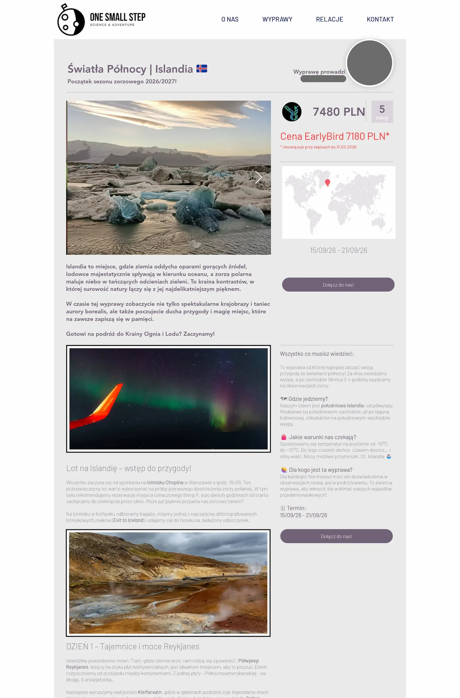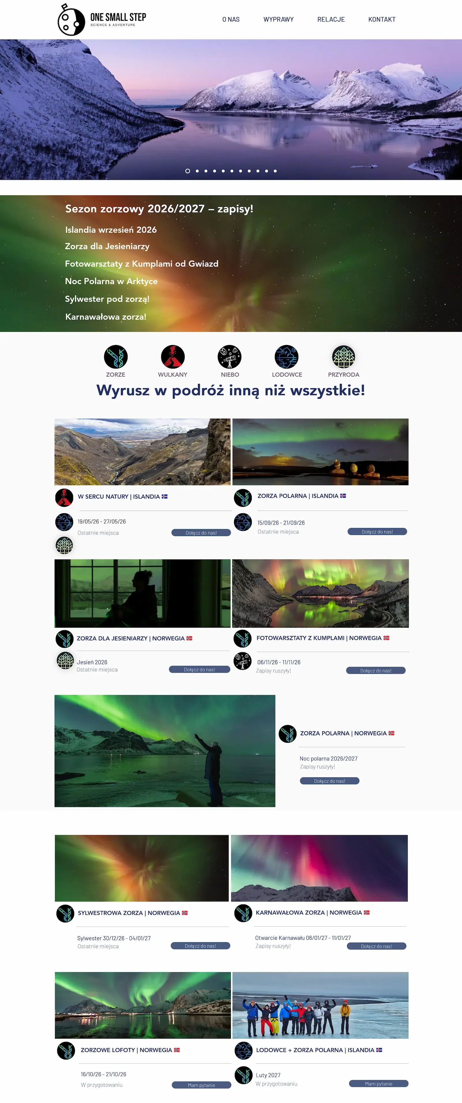 One Small Step to kameralne biuro podróży specjalizujące się w wyprawach popularno-naukowych. Organizuje wyjazdy dla osób ciekawych świata, łącząc podróżowanie z odkrywaniem nauki, przyrody i niezwykłych zjawisk naturalnych.